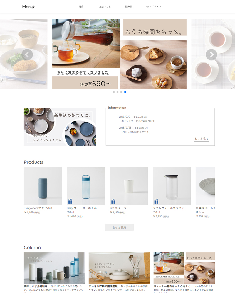 シンプルで扱いやすい食器類を主力商品と設定し、明るいキッチンの窓辺をイメージして白を基調にしています。また、使用バナーの多くはillustratorを使用して加工・文字入れを行いました。